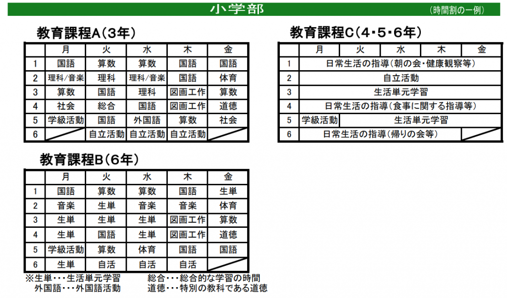 児童の実態に基づき、適切な学習指導が実施できるよう次の3種類の教育課程を編成しています。
