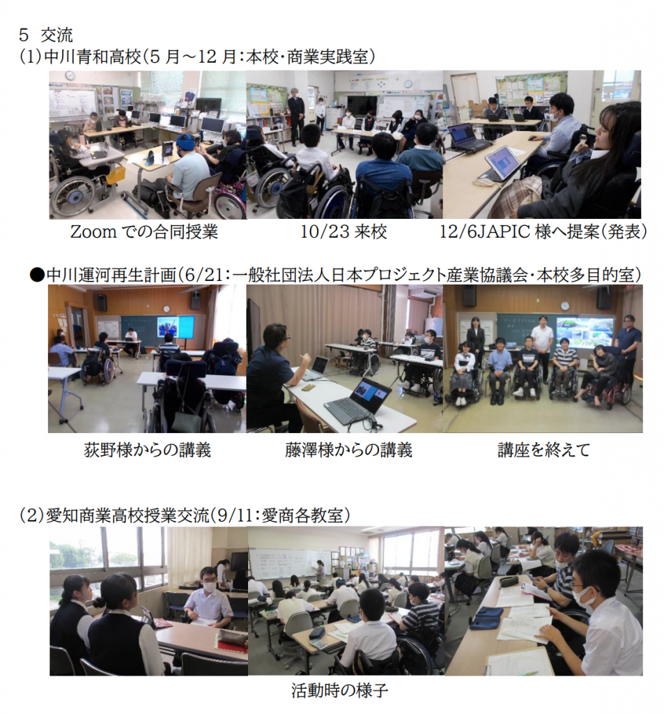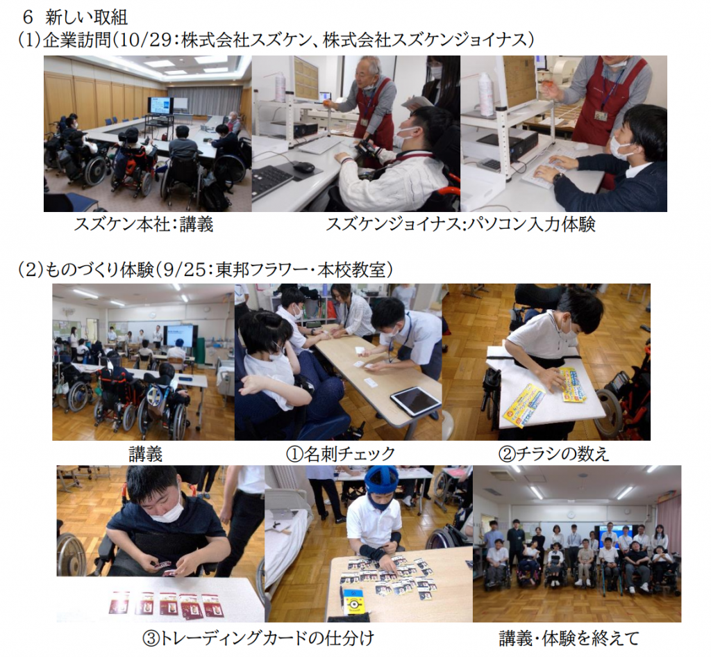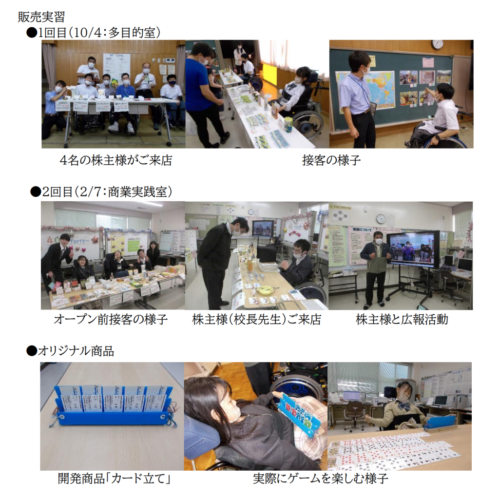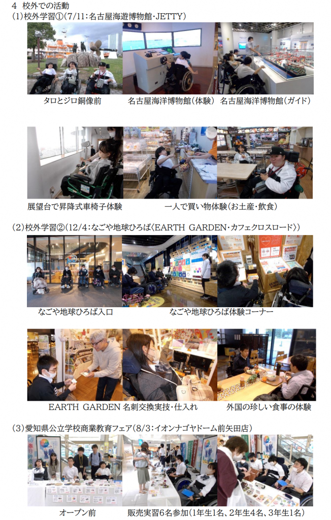 商業科目の学習では、自ら考えて学習に取り組むことを重視し、より実践的な力を身に付けられるよう工夫しています。特に、2・3年生の「課題研究」や「ネットワーク活用」では、校内での「写真展」や「販売実習」を自分たちで計画し、商業科目の横断的・総合的な学習を行います。また、SDGsの視点をもち、障害者自身も社会の一員であることから意識と自覚の促進を行っています。写真展では、発展途上国の写真を掲示し、伝え方の工夫を学んでいます。販売実習では、フェアトレード商品を扱い、仕入れから決算処理までを体験します。活動家から生産者の生活の様子や文化などを直接聞き、知識を深める機会を設けています。その他、エコ商品やオリジナル商品の開発を行っています。令和6年度はガラスアートに挑戦し、40周年記念のイメージキャラクターを生徒全員が関わり、完成させました。他には、中川運河のPRとして、オリジナルキーホルダーを販売しました。販売で得た利益は寄付しています。