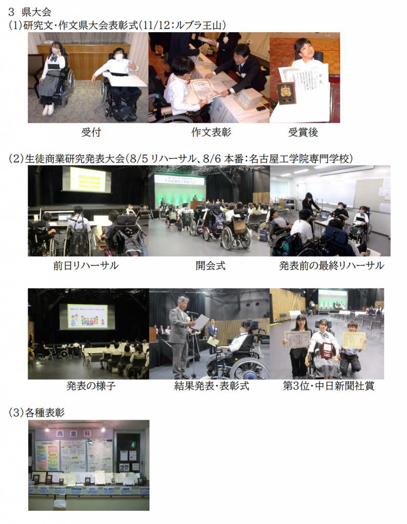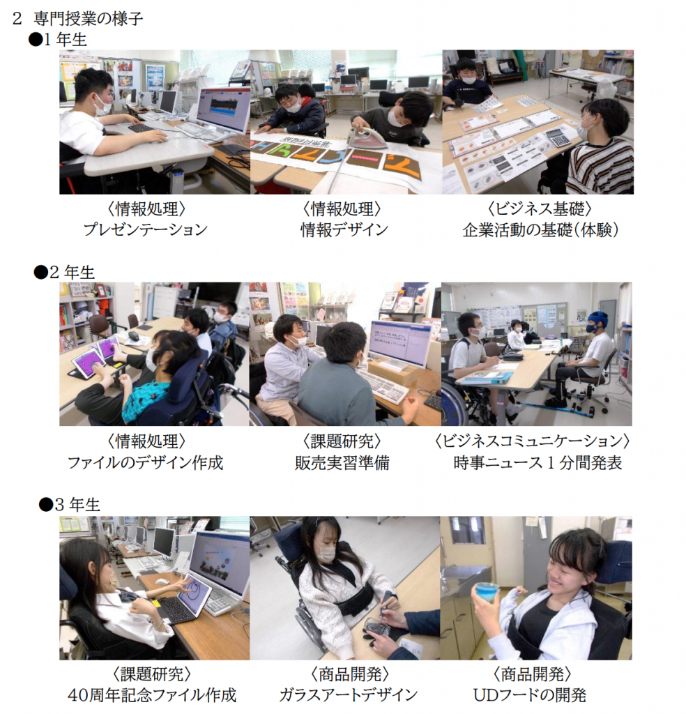 商業科が設置されている肢体不自由児の学校は全国でも珍しく、本校の特色の一つとなっています。商業科では、職業教育を主体として学び、社会自立を目指し、多様な生き方から幅広い分野で社会に貢献できる人材の育成を行っています。また、商業高等学校に準じた教育が行われ、卒業時には同等の卒業証書が授与されます。教科書や参考書、問題集は商業高等学校の生徒と同じものを使用しています。そのため、座学だけではなく、前期と後期に行われる定期テストや小テスト、実習を全員が履修します。着実に力を付け、卒業時には自分の「夢」を叶えましょう!